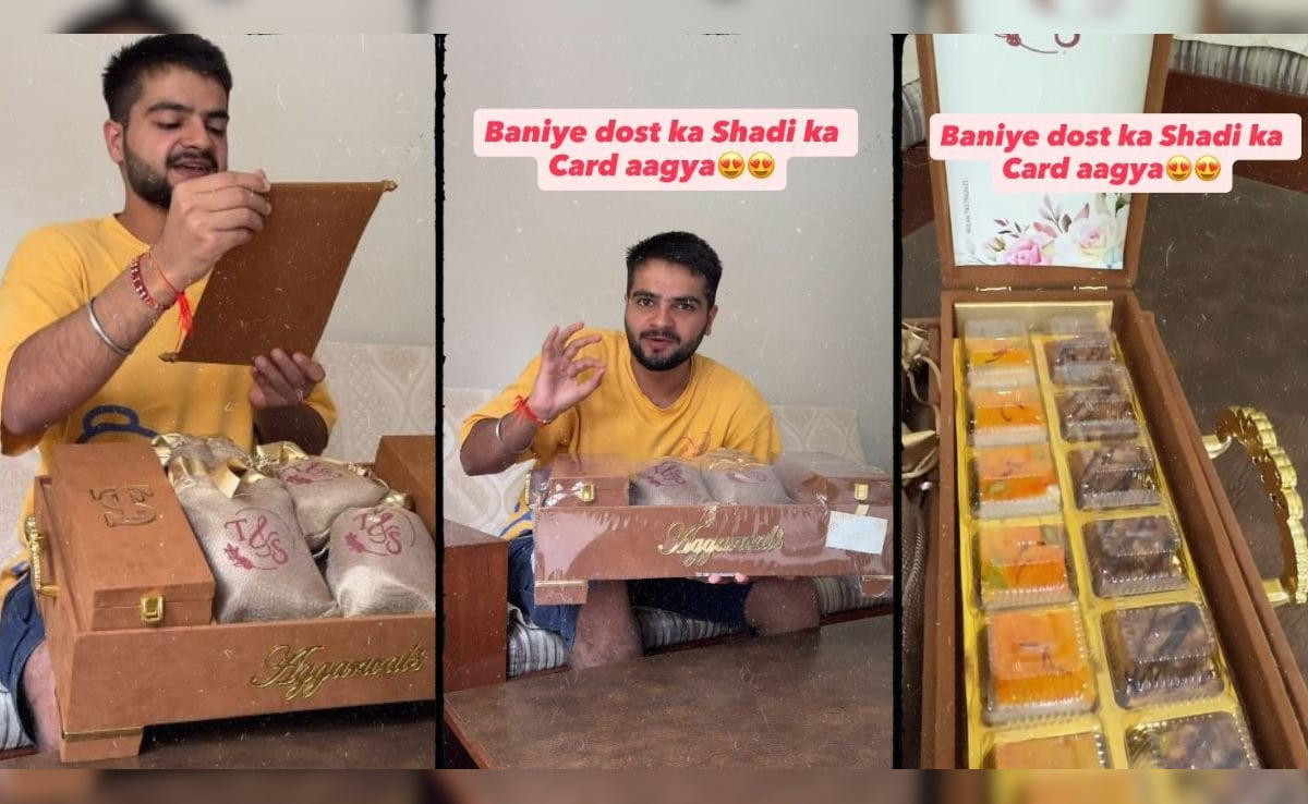 इंटरनेट पर वायरल इस वीडियो में एक शख्स अपनी दोस्त की शादी के कार्ड दिखाता नजर आता है और अपनी खुशी बयां करते हुए बास्केट के अंदर रखी हर चीज को खोल-खोलकर भी दिखाता है.