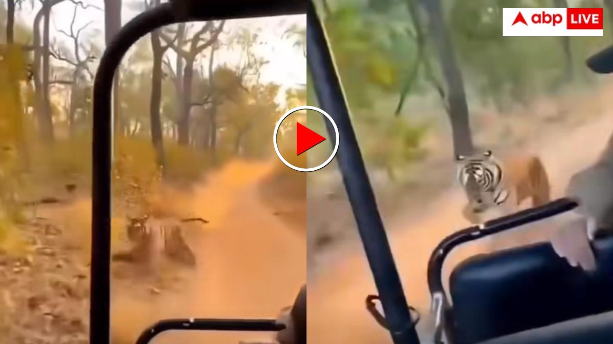 सफारी पर गए पर्यटकों की जीप पर टाइगर का हमला! जान लेने दौड़ा दरिंदा- वीडियो देख थम जाएंगी सांसें
